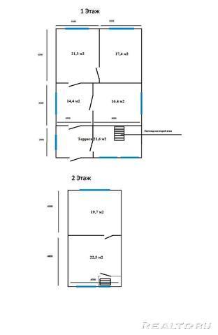 Первый этаж: терраса (21,6 м2), кухня (14,14 м2) и три добротных комнаты (21,32+17,42+16,4 м2).