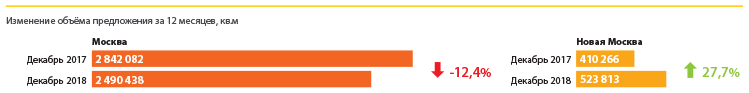За весь 2018 год на рынок новостроек в старых границах Москвы вышли на продажу 59 новых проектов (82 корп.), а также 92 корпуса в уже реализуемых проектах. Несмотря на такое количество новых объектов, на фоне рекордного спроса, по итогам года мы наблюдаем снижение объемов предложения на уровне 12,4% по сравнению с показателями декабря 2017 года. Рынок новостроек Новой Москвы за 2018 год пополнился 73 корпусами, вышедшие на реализацию объемы полностью компенсировали ушедшие за счет высокого спроса с рынка квартиры, по итогам года отмечается прирост объема предложения на уровне 27,7%по сравнению с показателями декабря 2017 года.