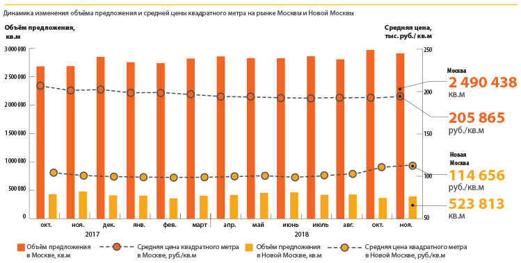 В декабре 2018г. средневзвешенная цена НАО составила 117,4 тыс. р./кв. м., прирост относительно ноября составил 2,9%. Средневзвешенная цена ТАО в исследуемый период прибавила 0,5% и составила 71,9 тыс. р./кв. м».