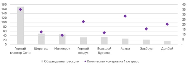 Аналитики консалтинговой компании NF GROUP проанализировали обеспеченность крупнейших горнолыжных курортов России качественным номерным фондом. Показатель в среднем составляет 24 номера на 1 км трасс. Наибольший коэффициент обеспеченности характерен для курортов горного кластера Сочи («Роза Хутор», «Красная поляна» и «Газпром Поляна») – 35 номеров на 1 км трасс.