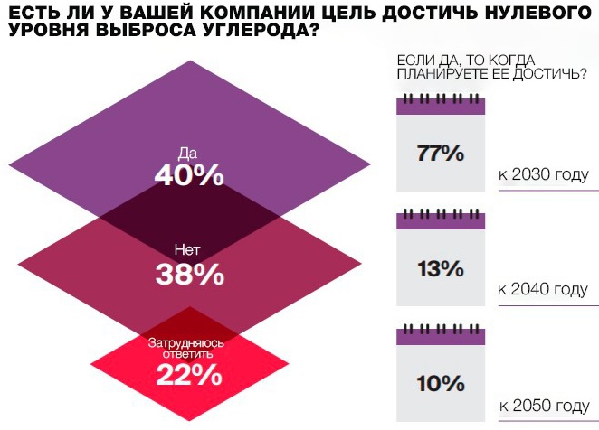 Результаты опроса демонстрируют растущий интерес игроков рынка офисной недвижимости к экологической устойчивости: 40% респондентов планируют достичь нулевого выброса углерода, 77% из них рассчитывают сделать это к 2030 году.