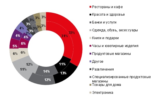 Представители ресторанного сегмента также показали наибольший прирост среди арендаторов центрального стрит-ритейла за прошедший год: доля таких операторов теперь составляет 33%. Новые точки в центре столицы открыли такие бренды, как сеть бургерных BB & Burgers (новые точки на улицах Мясницкой, 1-й Тверской-Ямской, Маросейке), Burger Heroes (в Камергерском переулке и на Садовом кольце), израильская сеть кофеен Cofix (на Тверской и Пятницкой), а также выход на московский рынок петербургских сетей «Марчеллис» и Ketch Up Burger.