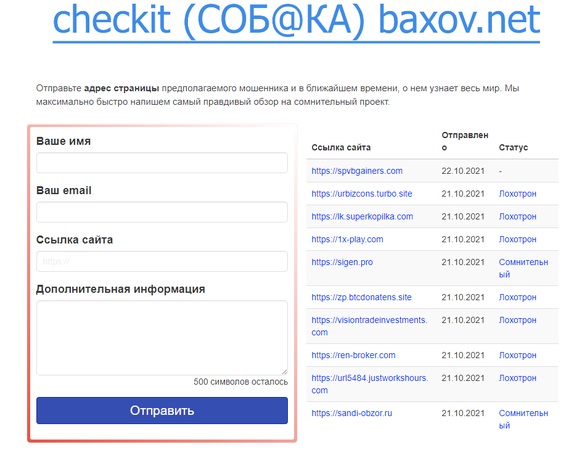 Что делать, если вы не нашли в списке лохотронов тот, который интересует вас? Вероятно, проект стоящий? Вовсе нет. Мошенников слишком много, а разоблачителей мало. Не все негодяи попадают в поле зрения. Но вы всегда можете написать в поддержку baxov.net с просьбой обратить внимание на интересующий вас ресурс. Это бесплатно. Модераторы проверят данные и вынесут свой вердикт.