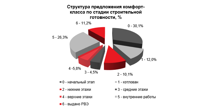 В общей структуре предложения квартир комфорт-класса в границах старой Москвы наибольшую долю занимают дома на начальных этапах строительства – 30,1%, чуть меньше показатель на этапе внутренних работ – 26,3%.