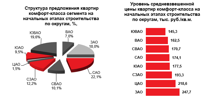 Наибольшая часть предложения на начальных этапах строительства сосредоточена в САО и ЮВАО – 22,1% и 19,6% соответственно. При этом ЮВАО является и самым бюджетным районом, средняя цена в нем составляет 145,3 тыс. руб./кв. м. Самым дорогим районом стал ЗАО – 247,7 тыс. руб./кв. м.