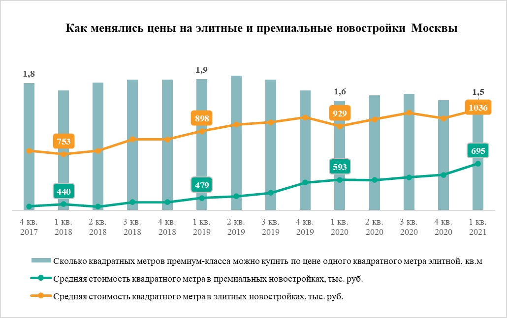 Цены на элитные и премиальные новостройки постепенно сближаются. В I квартале 2021 года. по данным «Метриум», средняя стоимость квадратного метра в элитных новостройках составила чуть более 1 млн рублей, что на 6% больше, чем в IV квартале 2020 года (978 тыс. рублей), и на 11% больше, чем год назад, в I квартале 2020 года, когда новое элитное жилье застройщики продавали в среднем за 930 тыс. рублей за кв.м.