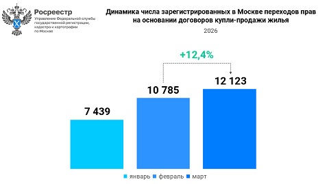 В марте 2026 года Управлением Росреестра по Москве зарегистрировано 12 123 перехода прав на основании договоров купли-продажи жилой недвижимости. За месяц (февраль 2026 года – 10 785) число таких сделок выросло на 12%.