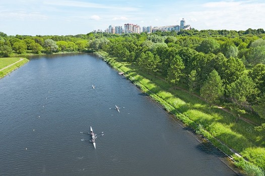 В жилом проекте, который реализуется на участке 65 га в Тушинской пойме, около половины территории отведено под благоустройство и озеленение, включая Центральный и Прибрежный парки, где создается система общественных зон, направленных на эмоциональное и физическое восстановление.