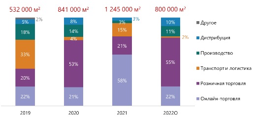Абсолютное большинство складских площадей, заявленных к вводу в 2022 году, – это проекты, стартовавшие еще в прошлом году. Рекордное значение по вводу является следствием резкого роста рынка и заключением крупнейших сделок в 2020–2021 гг.
