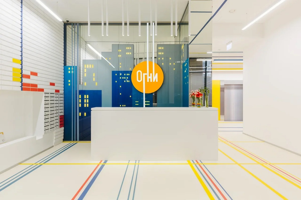 Дизайн-проект интерьеров, разработанный специально для «Огней», основан на стилистике и философии бренда: яркие краски символизируют яркую активную жизнь, наполненную эмоциями, энергией и радостью. Базовым цветом интерьера был выбран белый: на фоне белоснежных стен и наливных полов еще сочнее выглядят цветные элементы дизайна – стеновые панели из закаленного стекла стемалит и декоративные полосы синих, желтых и красных оттенков, переходящие с пола на стены, потолок, reception, почтовые ящички.