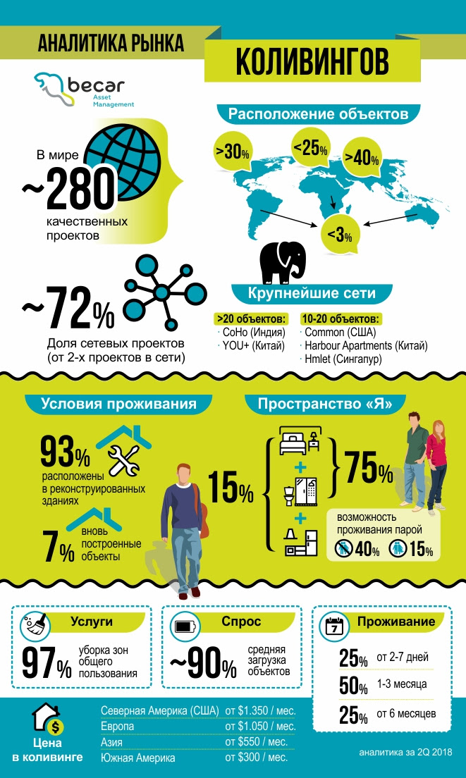Формат коливингов, несмотря на свою молодость, активно наращивает обороты. На сегодняшний день в мире насчитывается около 280 качественных проектов. Основные тенденции международного рынка коливингов, произошедшие в первом полугодии 2018 года – в обзоре Becar Asset Management.