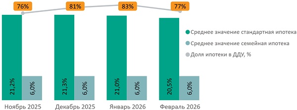 Доля сделок с привлечением ипотечного кредита за февраль сократилась на 6 п.п. и достигла 77%. Средняя ставка по стандартной ипотеке за месяц сократилась на 0,5 п.п., составив 20,5%.