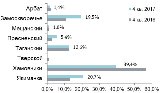 По количеству квартир в продаже на первой строчке также расположился район Хамовники (39,4%; -17,2 п.п. относительно конца 2016 года). На втором месте – Якиманка (20,7%, +7,6 п.п.), на третьем – Замоскворечье (19,5%, +8,7 п.п.).