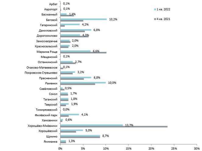 Наиболее существенное снижение показателя отмечено в районах Мещанский (-14,4%), где в реализации остался один проект «Усадьба Manor (Резиденции на Садовой-Сухаревской)» и Тимирязевский (-13,4%), где распродаются остатки в построенном комплексе.