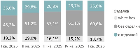 В структуре экспозиции по типу отделки выросла доля предложения с чистовой отделкой (25,6%, +1,9 п.п. за квартал), сократилась доля помещений без отделки (60,6%, -0,5 п.п.) и с отделкой white box (13,7%, -1,5 п.п.).