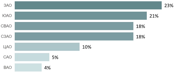 Среди округов по объему предложения лидирует СЗАО (1,1 тыс. лотов), на втором месте – ЗАО (1,0 тыс. лотов)