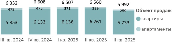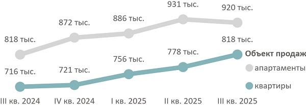 По подсчетам аналитиков «Метриум», средневзвешенная цена квадратного метра квартир и апартаментов по итогам III квартала 2025 года составила 823 410 руб. (+5% за квартал, +14% за год). Средневзвешенная цена квартир – 818 320 руб. за кв. м (+5% за квартал, +14% за год), апартаментов – 920 050 руб. за кв. м (-1% за квартал, +12% за год).