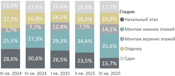На фоне сокращения стартов новых проектов в премиум-классе третий квартал подряд отмечается тенденция к сокращению доли предложения на начальной стадии строительства (15,7%, -7,8 п.п. за квартал) и рост доли предложения в корпусах на стадии монтажа этажей (49,4%, +7,8 п.п. за квартал).