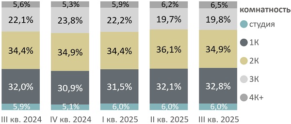 В структуре предложения по типологии не произошло значительных изменений. Максимальная доля приходится на двухспальный формат (34,9%, -1,2 п.п. за квартал)