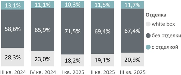 Максимальную долю предложения составляет формат без отделки (67,4%, -2 п.п. за квартал), на предложения с чистовой отделкой приходится 11,7% (+0,2 п.п.) объема, с отделкой white box – 20,9% рынка (+1,8 п.п.).