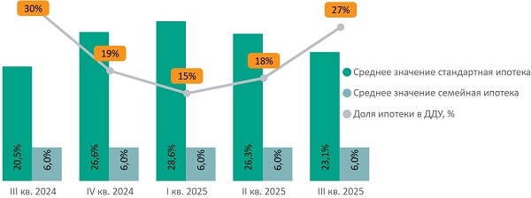 Доля сделок с привлечением ипотечного кредита в III квартале составила 27% (+9 п.п. за квартал, -3 п.п. за год).