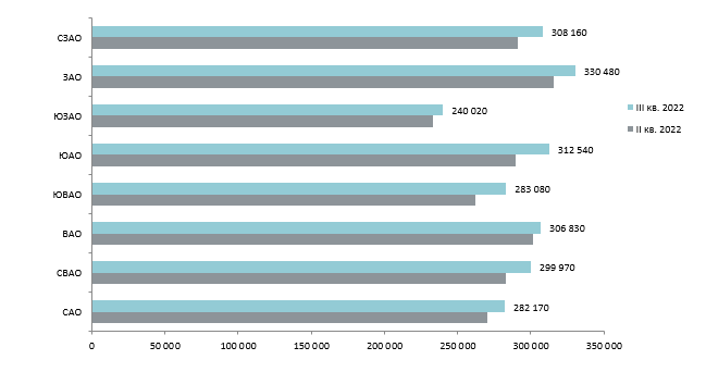 По подсчетам аналитиков «Метриум», средневзвешенная цена кв. метра в сентябре составила 295,5 тыс. руб. (+0,9% за месяц, +5,6% за квартал, +15,7% за год). Наибольший рост произошел в ЮАО и ЮВАО (+7,9%).