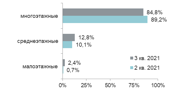 Превалирующий объем экспонируемых квартир располагался в многоэтажных новостройках – 84,8% (-4,4 п.п.). Доля квартир в среднеэтажных домах повысилась и достигла 12,8% (+2,7 п.п.). Меньше всего квартир представлено в малоэтажных корпусах – их доля составила всего 2,4% (+1,7 п.п.).