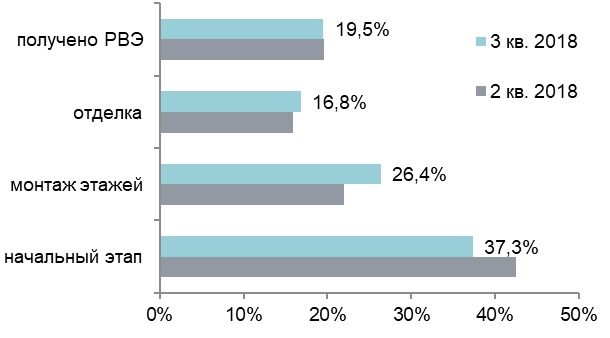 На текущий момент на первичном элитном рынке не представлено ни одного проекта на начальной стадии строительной готовности. Наибольшая часть квартир экспонируется в корпусах, уже получивших разрешение на ввод в эксплуатацию (42,5%, +6 п.п.). Лоты в домах на этапе монтажа этажей заняли 30,1% рынка (-8,0 п.п.), на этапе отделки – 27,4% (+2 п.п.).