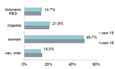 В конце июля наибольший объем предложения был представлен в новостройках на этапе монтажа этажей (49,7%; -0,5 п.п.). Процент квартир в домах на стадии отделочных работ увеличился и составил 21,6% (+0,8 п.п.). Приблизительно равные доли занимают лоты в уже введенных в эксплуатацию домах (14,7%; 0,7 п.п.) и на начальной стадии строительной готовности (14%; -1,0 п.п).