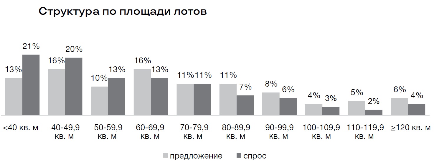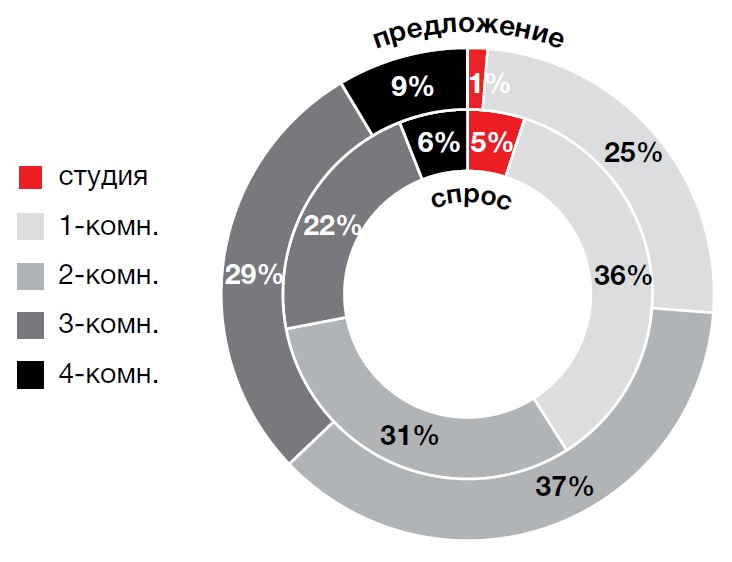 Важно отметить, что в структуре распределения спроса по комнатности преобладают однокомнатные лоты (36%), а в структуре предложения – двухкомнатные (37%).
