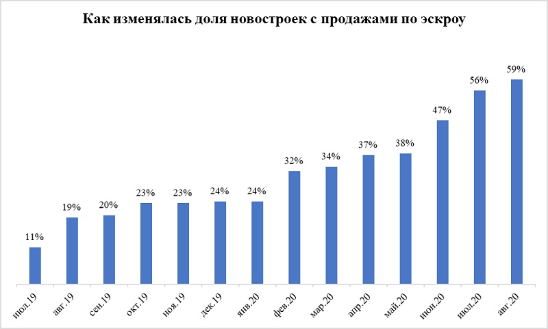 По данным «Метриум», доля новостроек в массовом сегменте, реализуемых с использованием эскроу-счетов с июля 2019 года по август 2020 года выросла с 11% до 59%. Наибольший прирост таких проектов пришелся на июнь – август 2020 года.