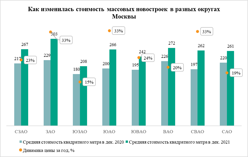 Рекордное повышение средних цен отмечено в новостройках Южного административного округа столицы (ЮАО). Здесь показатель увеличился с 200 тыс. рублей в декабре 2020 года до 266 тыс. рублей в декабре 2021 года, то есть на 33,2%.