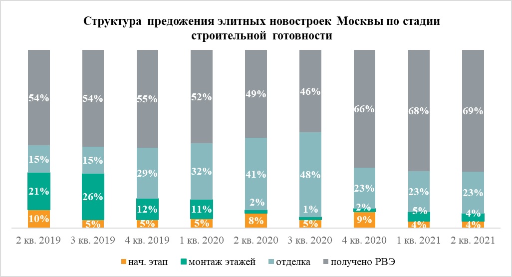 Во II квартале 2021 года девелоперы элитных новостроек Москвы продавали на начальной стадии строительства 45 квартир и апартаментов, что составляет всего 4% от суммарного объема предложения, подсчитали аналитики «Метриум». При этом 69% вариантов жилья продаются в готовых домах.