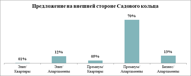 На сегодняшний день на внешней стороне Садового кольца (на удалении не более 500 метров) ведутся первичные продажи в 15 жилых и апартаментных комплексах (Без учета комплексов апартаментов Cameo и High Garden, продажи в которых ведутся в закрытом режиме). В общей сложности в них представлено немногим более 1,2 тыс. лотов, что составляет 22% от общего объема предложения в Центральном административном округе.