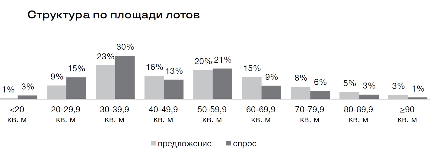 Как в структуре спроса, так и в структуре предложения по площади можно выделить две основные группы – это одно- и двухкомнатные квартиры в диапазоне от 30 до 40 кв. м и от 50 до 60 кв. м. При этом промежуточные метражи представлены умерено и пользуются меньшей популярностью. Данные показатели говорят о большей ориентации Московской области на классические форматы квартир.