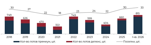 По итогам I квартала 2026 года общий объем предложения на первичном рынке элитной загородной недвижимости Московского региона составил 815 лотов, что стало максимальным значением за последние восемь лет. Показатель вырос на 23% за квартал и на 70% в сравнении с аналогичным периодом 2025 года. Основную долю предложения (91%) формируют объекты премиум-класса, 9% – коттеджи и участки в проектах класса делюкс. Открытые продажи по итогам I квартала велись в 33 коттеджных поселках, из которых 26 относятся к премиум-классу и семь – к делюкс-классу.