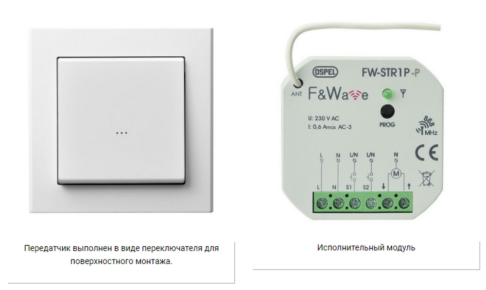 Если же на этапе строительства дома или капитального ремонта не было принято решение об установке «системы умный дом», ничего не потеряно. OSPEL SA в сотрудничестве с F&F представила на рынке беспроводные элементы управления, основанные на радиопередаче.