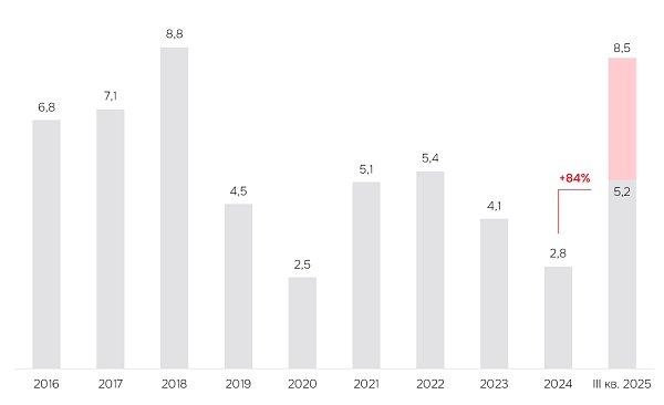 По данным консалтинговой компании IBC Real Estate объем номерного фонда в гостиницах России достиг по итогам III квартала 2025 года 179,8 тыс. номеров в сетевых и несетевых классифицированных гостиницах 3-5 звезд с номерной фондом более 100 номеров. Объем нового строительства с начала года достиг 5,2 тыс. номеров, что втрое превышает результат за три квартала 2024 года и практически вдвое превосходит объем ввода за весь прошлый год. Ожидается, что по итогам 2025 года номерной фонд в гостиницах России пополнится на 8,5 тыс. номеров, что станет практически сопоставимым с рекордным за последние десять лет результатом в 2018 году (8,8 тыс. номеров).