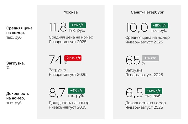 Операционные показатели гостиниц Москвы и Санкт-Петербурга, январь-август 2025.