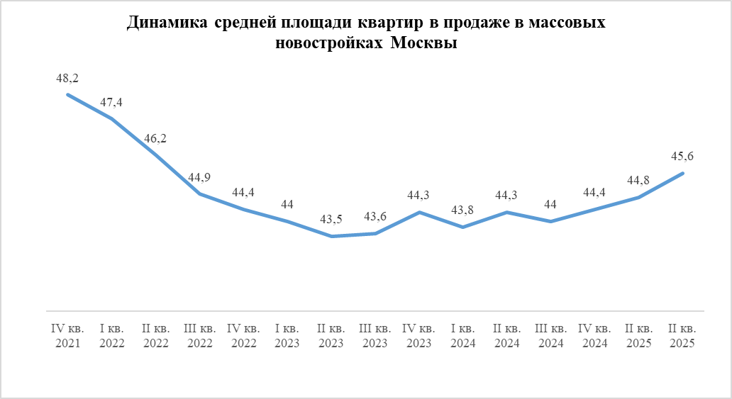После периода уменьшения средней площади предложения квартир и апартаментов в столичных новостройках массового сегмента эксперты компании SIS Development отмечают тенденцию к увеличению показателя. В мае 2025 года средняя площадь помещений в таких новостройках достигла 45,6 кв. м, что является максимальным значением с 2022 года.