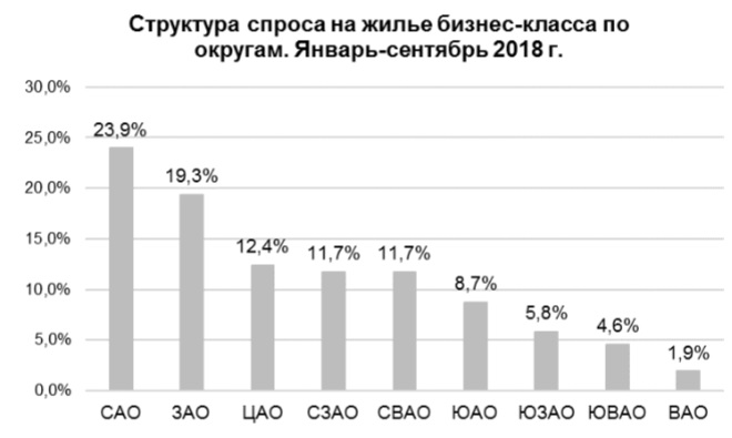 По итогам прошедших трех кварталов 2018 года лидером спроса в сегменте бизнес стал САО, где в реализации (по ДДУ) представлено 16 проектов. Второе место занимает ЗАО с 20-ю проектами, на третьем ЦАО с 11-ю комплексами.