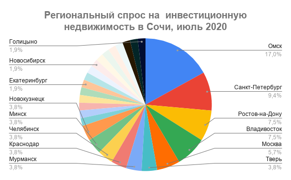 В июле 2020 года больше всего запросов на покупку инвестиционных объектов поступило от жителей Омска. Доля этого города составила 17%. Вторую строчку занял Санкт-Петербург с результатом - 9,4%. Также в тройку вошли Ростов-на-Дону и Владивосток. Результат этих городов составил 7,5%.