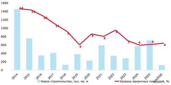 По итогам I кв. 2026 г., в Москве девелоперы ввели в эксплуатацию порядка 117 тыс. кв. м офисной недвижимости. Показатель вырос в 26 раз по сравнению с аналогичным периодом 2025 г., когда рынок пополнился всего на 4,4 тыс. кв. м. Резкий рост объема нового предложения связан с переносом сроков ввода в предыдущий год. По нашим прогнозам, в 2026 году объем ввода на офисном рынке недвижимости Москвы может составить 650-700 тыс. кв. м.