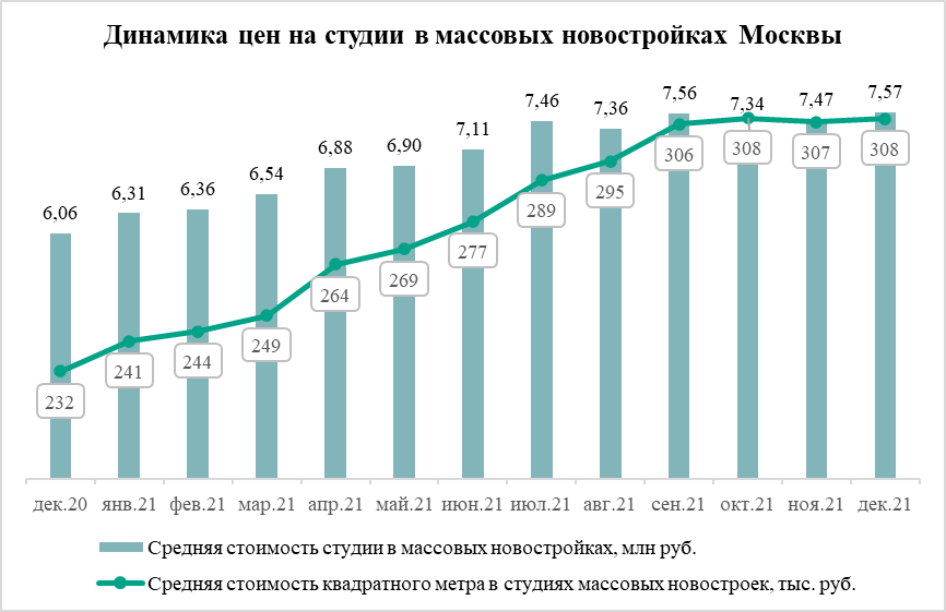 В декабре 2021 года средняя стоимость студий в новостройках эконом- и комфорт-класса в Москве достигла 7,57 млн рублей. В том же месяце 2020 года студию можно было приобрести за 6,06 млн рублей. Таким образом, за 12 месяцев этот тип квартир подорожал на 25% или на 1,52 млн рублей. То есть каждый месяц студии в массовых новостройках Москвы росли в цене на 2%.