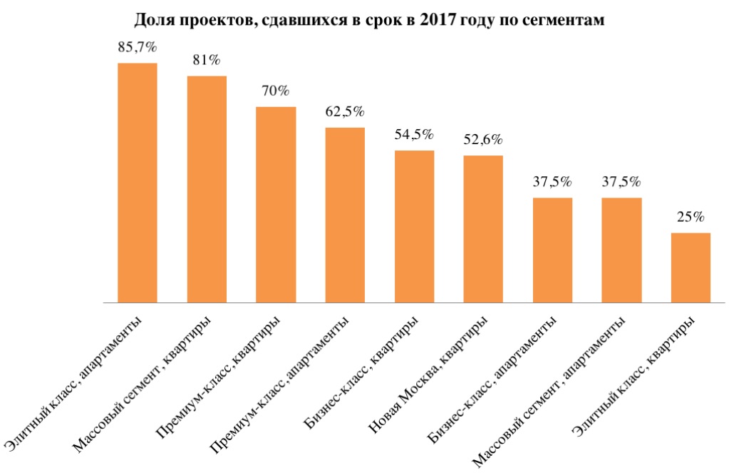 Самый большой процент просрочки эксперты «Метриум Групп» обнаружили в сегменте элитных жилых комплексов: из восьми заявленных проектов только 2 (25%) получили разрешение на ввод в эксплуатацию в 2017 году. Напротив, у элитных апартаментных комплексов оказался лучший показатель по соблюдению сроков – сдались 6 из 7 проектов (85,7%).