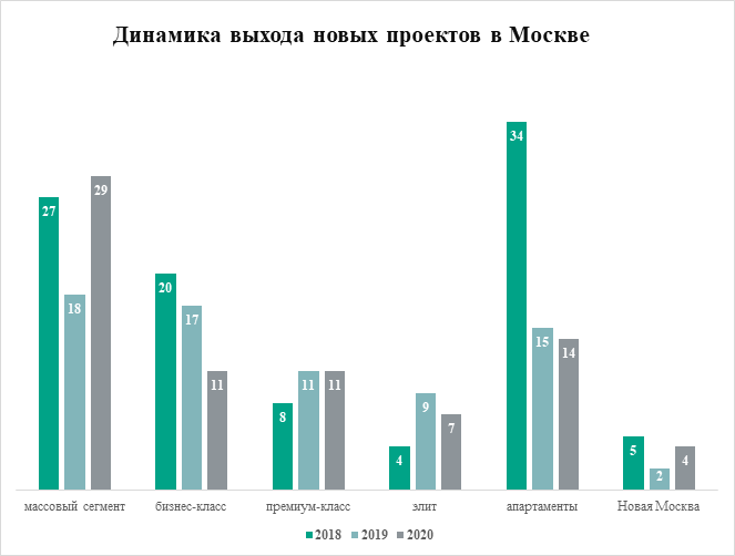В 2020 году на рынке новостроек Большой Москвы начались продажи 76 комплексов с квартирами и апартаментами. В 2019 году девелоперы дали старт реализации 72 проектов, а в 2018 году – 98 проектов. Таким образом, в 2020 году застройщики смогли нарастить темп выхода в продажу новых объектов, несмотря на локдаун, девальвацию рубля и временное падение спроса. В ушедшем году новых проектов было на 6% больше, чем в 2019 году, но всё же на 22% меньше, чем в 2018 году.