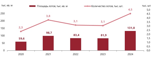 Основной объем нового предложения пришелся на второе полугодие – 83% общей площади лотов, выведенных на рынок в 2024 году. Повышение девелоперской активности по выводу новых объектов на рынок было обусловлено в том числе завершением 1 июля 2024 года действия программы ипотеки с господдержкой, что привело к сглаживанию различий в условиях покупки квартир и апартаментов. Предыдущий всплеск активности девелоперов был зафиксирован в 2019 году, до запуска льготной ипотеки: тогда объем нового предложения превысил 200 тыс. кв. м.