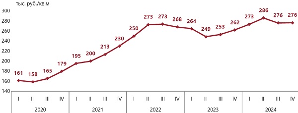 По состоянию на декабрь 2024 года средняя цена предложения на первичном рынке сервисных апартаментов Санкт-Петербурга составила 276 тыс. руб./кв. м (+6% за год). При этом в течение года динамика показателя носила разнонаправленный характер: в первом полугодии на фоне сокращения объема предложения наблюдалось удорожание экспозиции, после чего по мере расширения предложения была зафиксирована небольшая корректировка средней цены в III квартале (−3% за квартал), а затем – стабилизация в IV квартале.