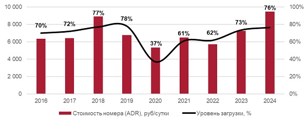 По итогам 2024 года средняя цена номера (ADR) в московских отелях, по данным Hotel Advisors, достигла 9,5 тыс. руб./сутки, увеличившись на 30% по сравнению с предыдущим годом. Наиболее выраженный рост цен зафиксирован в сегментах гостиниц категорий 3* и 5*, где стоимость номеров выросла на 34%. Средняя загрузка (OCC) за 2024 год оценивается в 76,4%, что на 4,3 п. п. больше показателя 2023 года. Самое значительное увеличение загрузки показали гостиницы категории 5*, продемонстрировав рост на 6 п. п.