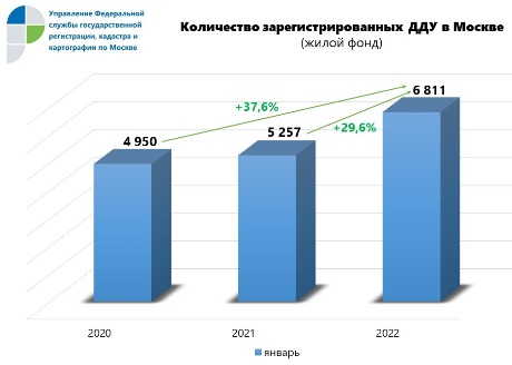 Управлением Росреестра по Москве в январе 2022 года зарегистрировано 10 239 договоров долевого участия в строительстве на рынке жилой и нежилой недвижимости – максимальный за все годы показатель, который на 35% превышает аналогичный период прошлого года (7 583 ДДУ) и на 54,6% больше значения 2020 года (6 624 ДДУ).